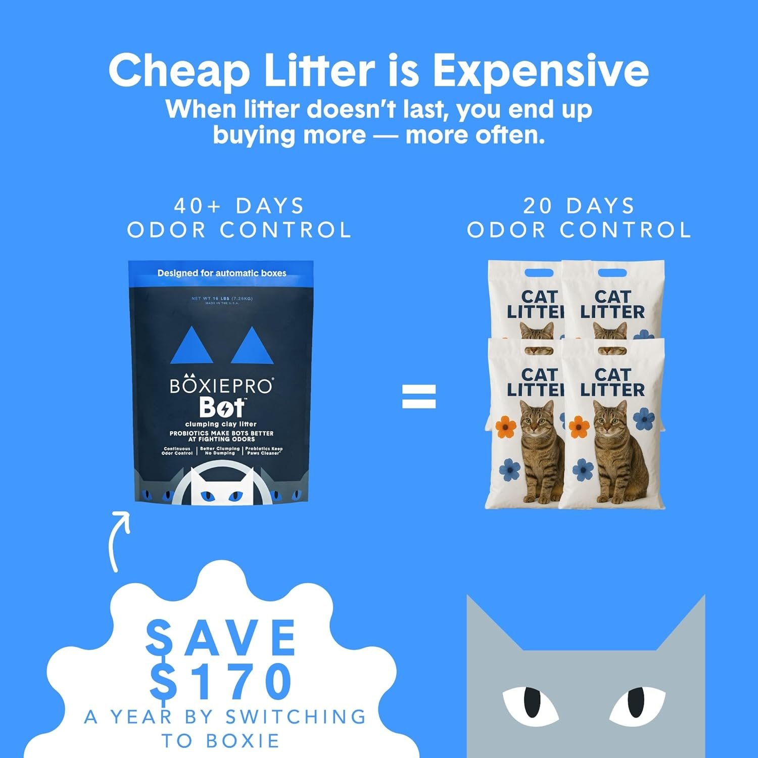 BoxiePro is generally higher priced than competitors but includes natural odor neutralization and an easy scoop formula that many users consider worth the premium for performance in standard litter box setups.