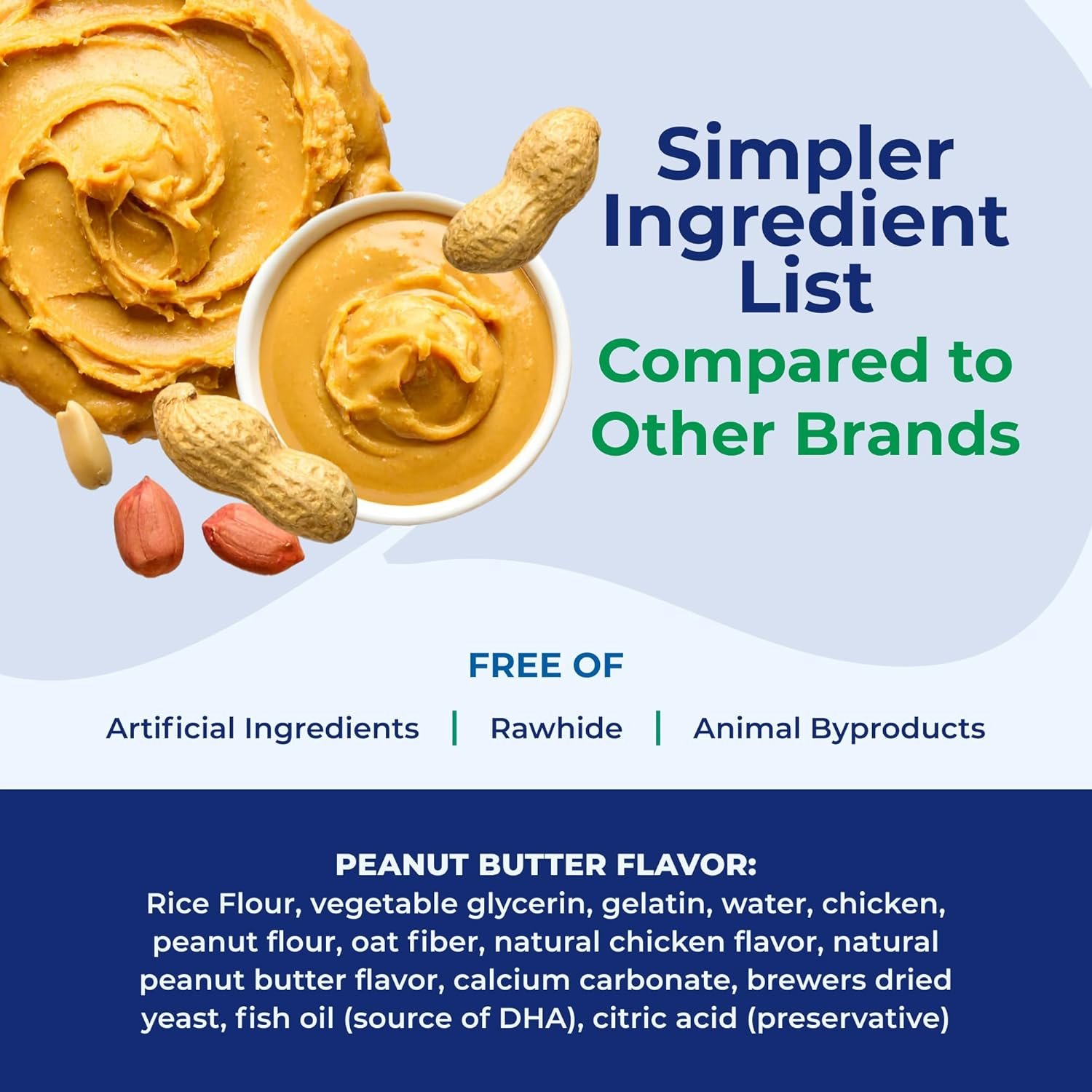 Compared to popular choices such as Greenies Puppy Dental Chews and Blue Buffalo Dental Bones, this product offers an edge with its rawhide free design, wheat free ingredients, and added DHA for brain health. The peanut butter flavor gives it broader appeal for picky eaters versus the typically mint or chicken flavored options.