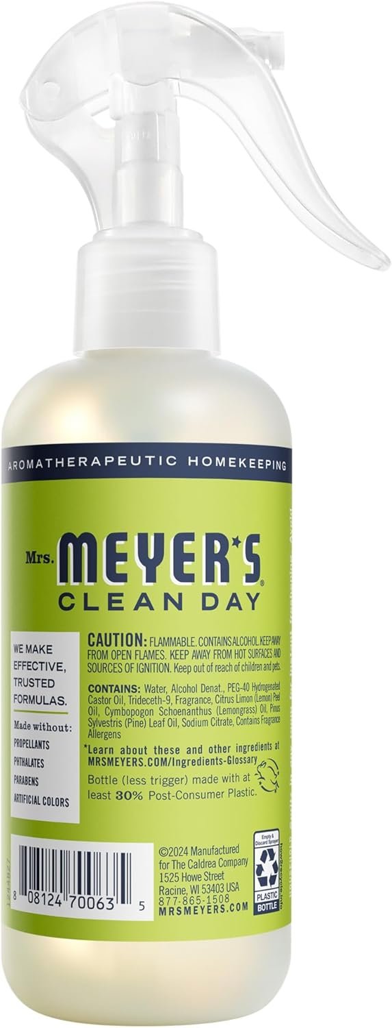 Refresh your space instantly with MRS. MEYER'S CLEAN DAY Room Spray in Lemon Verbena Scent. This non-aerosol room freshener uses essential oils and thoughtfully chosen, cruelty-free ingredients to deliver a light, garden-inspired citrus aroma. Free from propellants, parabens, phthalates, and artificial colors, it provides a clean, invigorating scent without compromise. Bring a breath of fresh air to your home with this trusted brand's uplifting, nature-inspired formula.