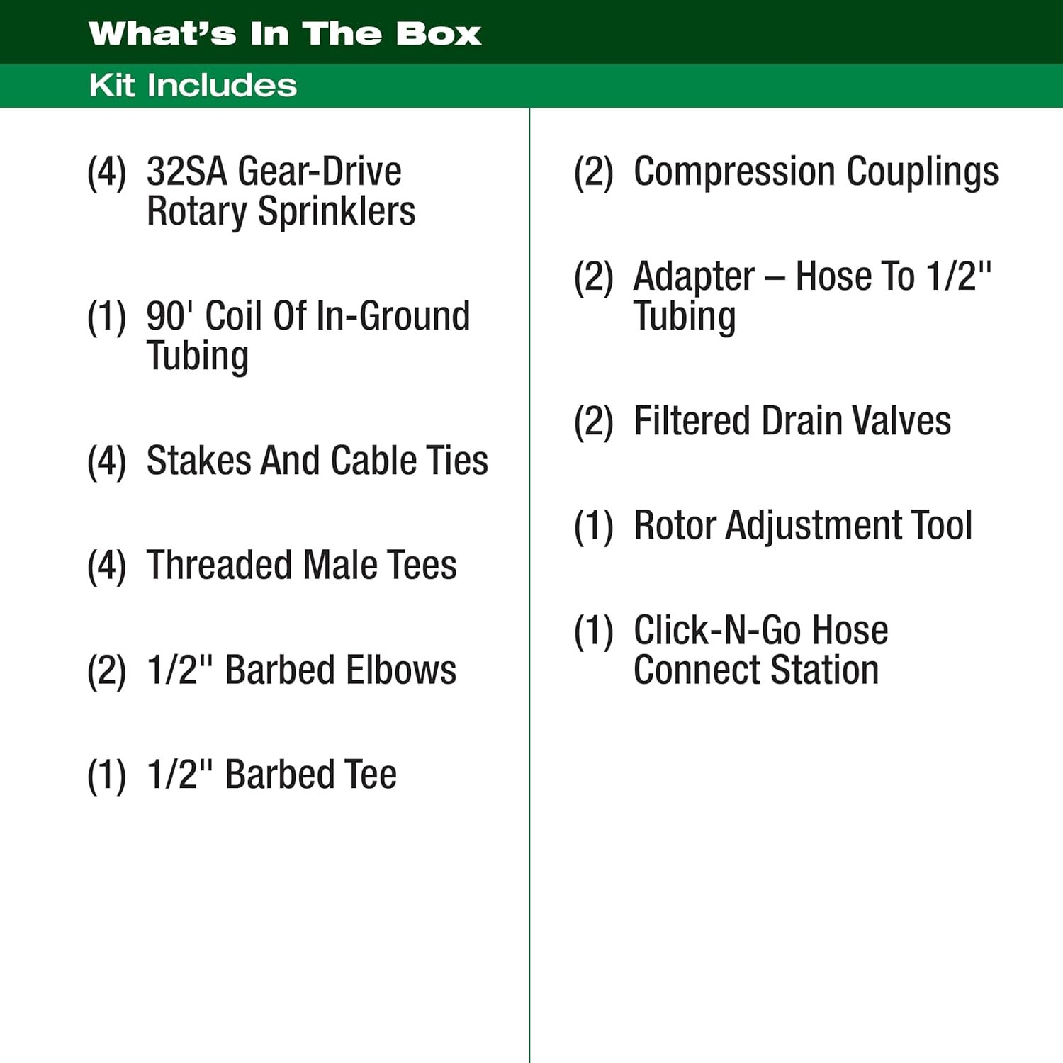 - Complete Kit: Includes distribution tubing, fittings, rotary heads, drain valves, and an adjustment tool—everything needed for streamlined installation.