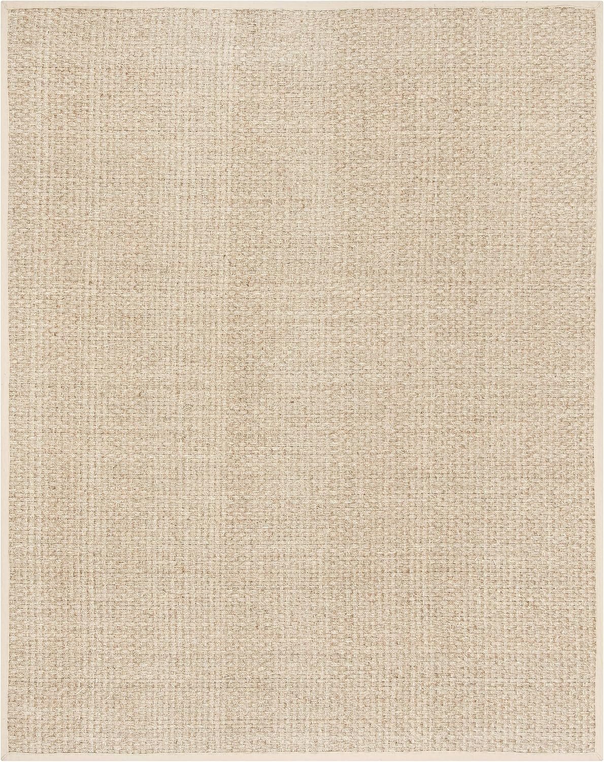 Crafted from 100% sustainable fibers, it features a textured basketweave seagrass design framed by a beige border, capturing the essence of coastal style rug decor. Its understated natural and beige tones pair well with farmhouse decor rug schemes or minimalist living spaces, offering both softness and resilience in high-traffic rooms.