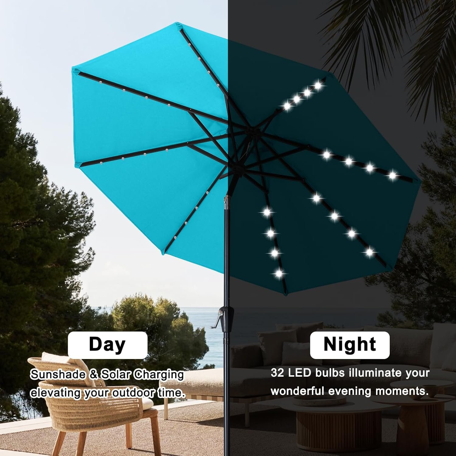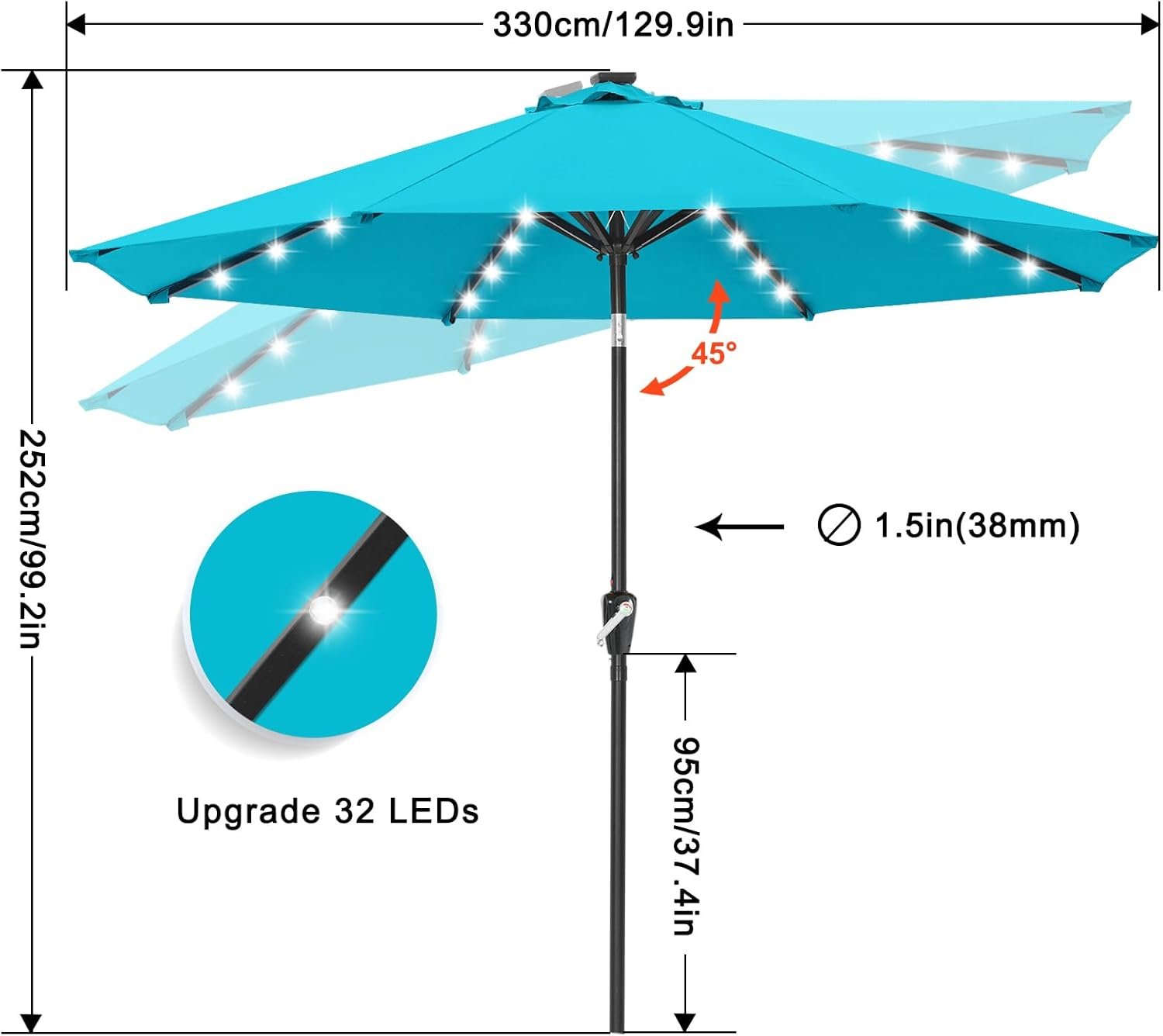 - Integrated LED Illumination: 32 solar powered lights ensure your outdoor table umbrella delivers gentle nighttime lighting without cords or outlets.