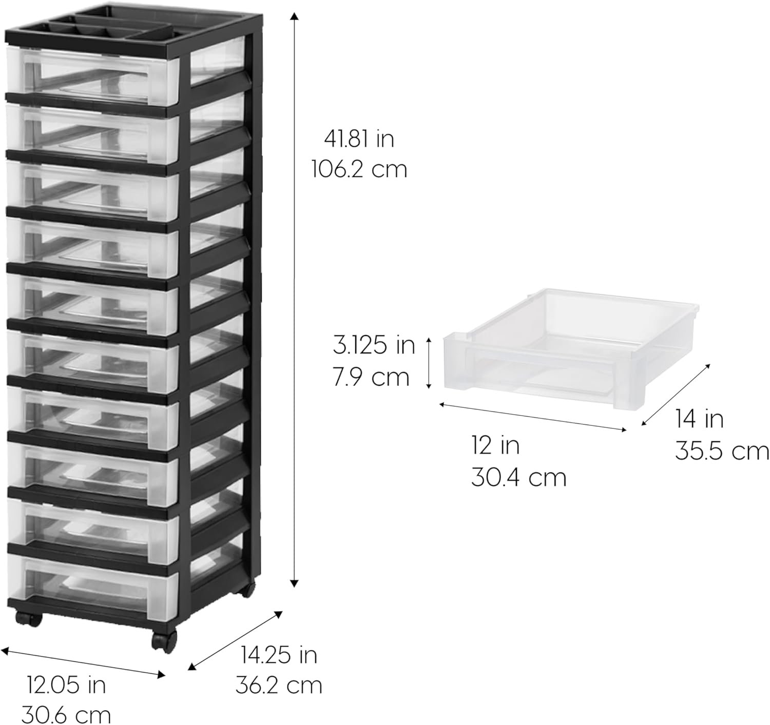 The IRIS USA Plastic Drawer Storage Organizer Rolling Cart is a versatile 10-drawer solution perfect for organizing your art supplies, crafts, office items, or clothing in any room. With durable, high-quality construction made in the USA, smooth-glide drawers with safety stops, and removable wheels for easy mobility, this organizer offers both convenience and reliability. Its sleek black and clear design blends seamlessly into any space, making it an essential storage upgrade for your home or office.