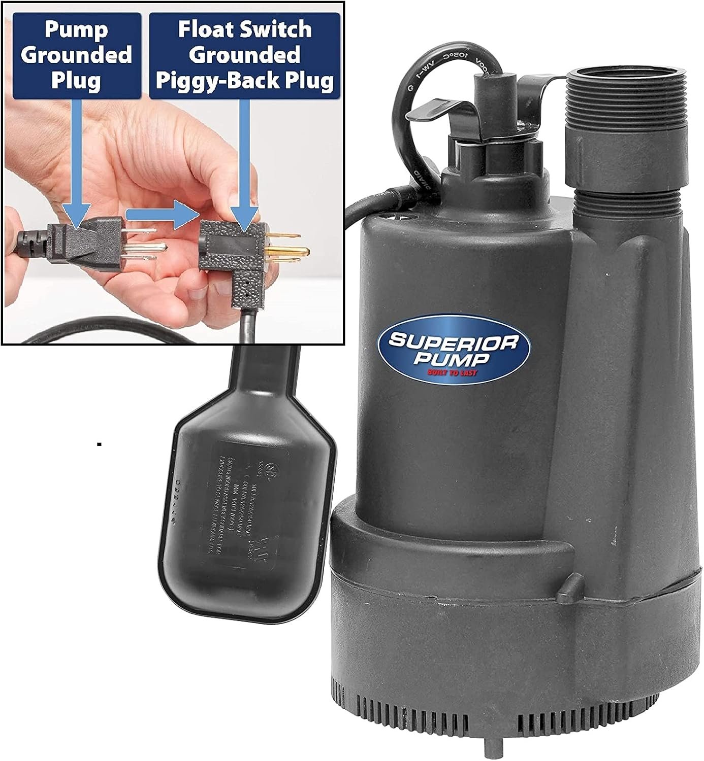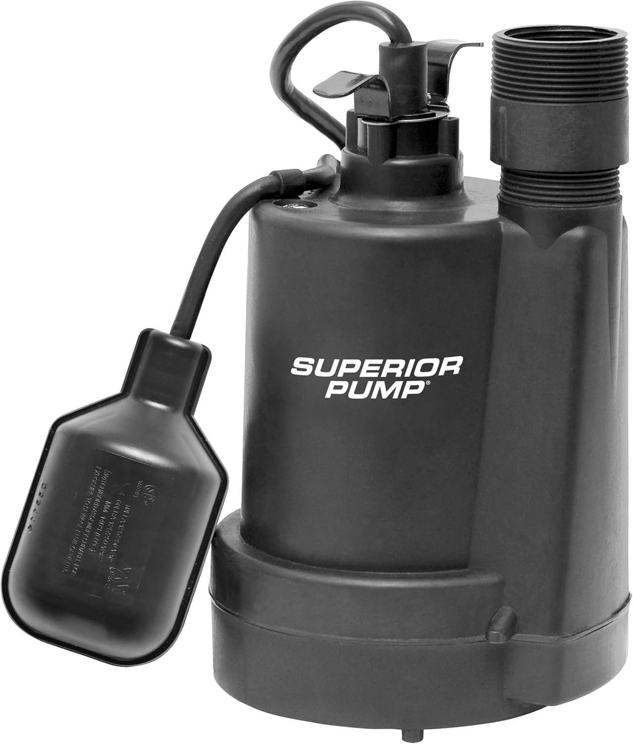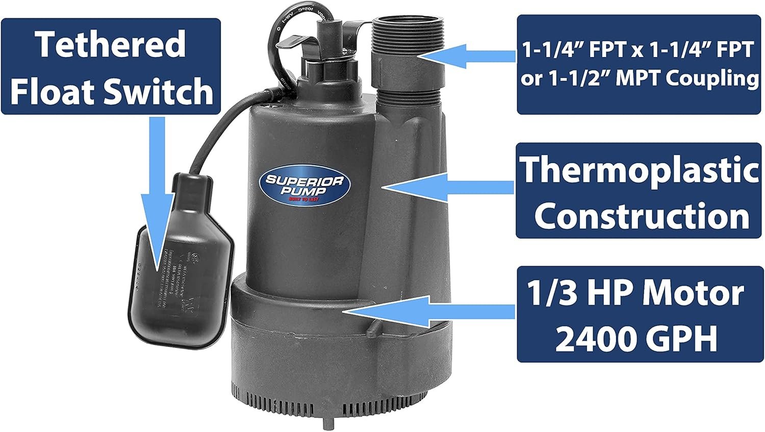 The Superior Pump 92330 1/3 HP Thermoplastic Submersible Sump Pump with Tethered Float Switch is designed for powerful and reliable performance, moving up to 2,400 gallons per hour and lifting water up to 25 feet vertically. Built by Superior Pump with durable thermoplastic construction, it features a convenient tethered float switch for automatic operation and pumps down to 1/2 inch when used as a utility pump. With its high-capacity NPT discharge options and a 10-foot power cord, this factory-tested sump pump is engineered for long-lasting, worry-free use—making it an excellent choice for protecting your basement or crawl space.