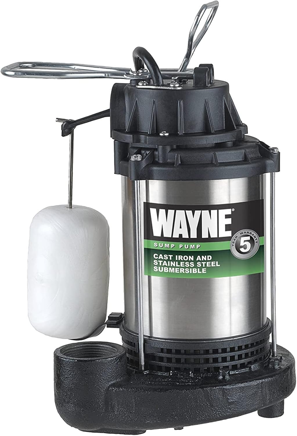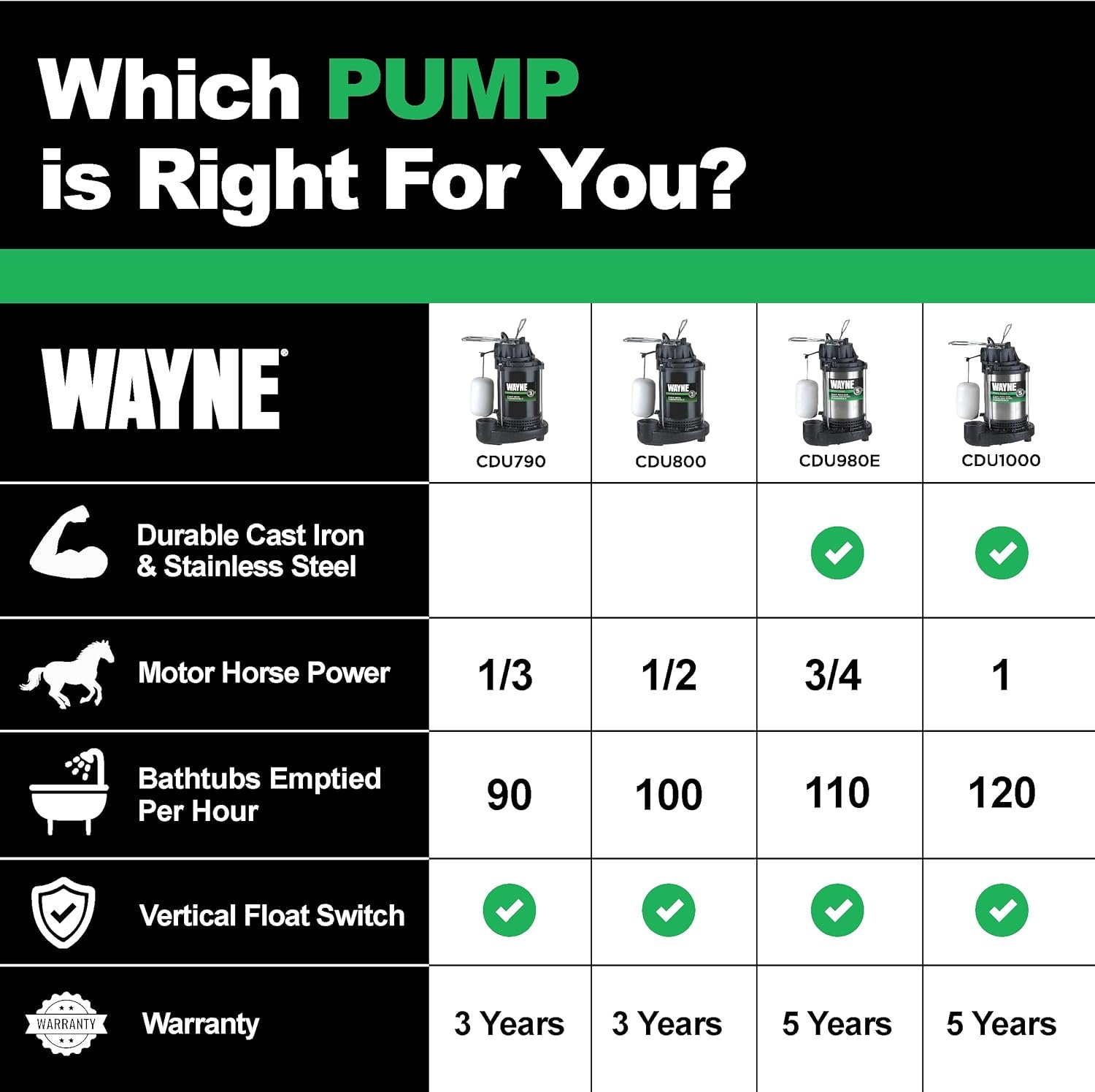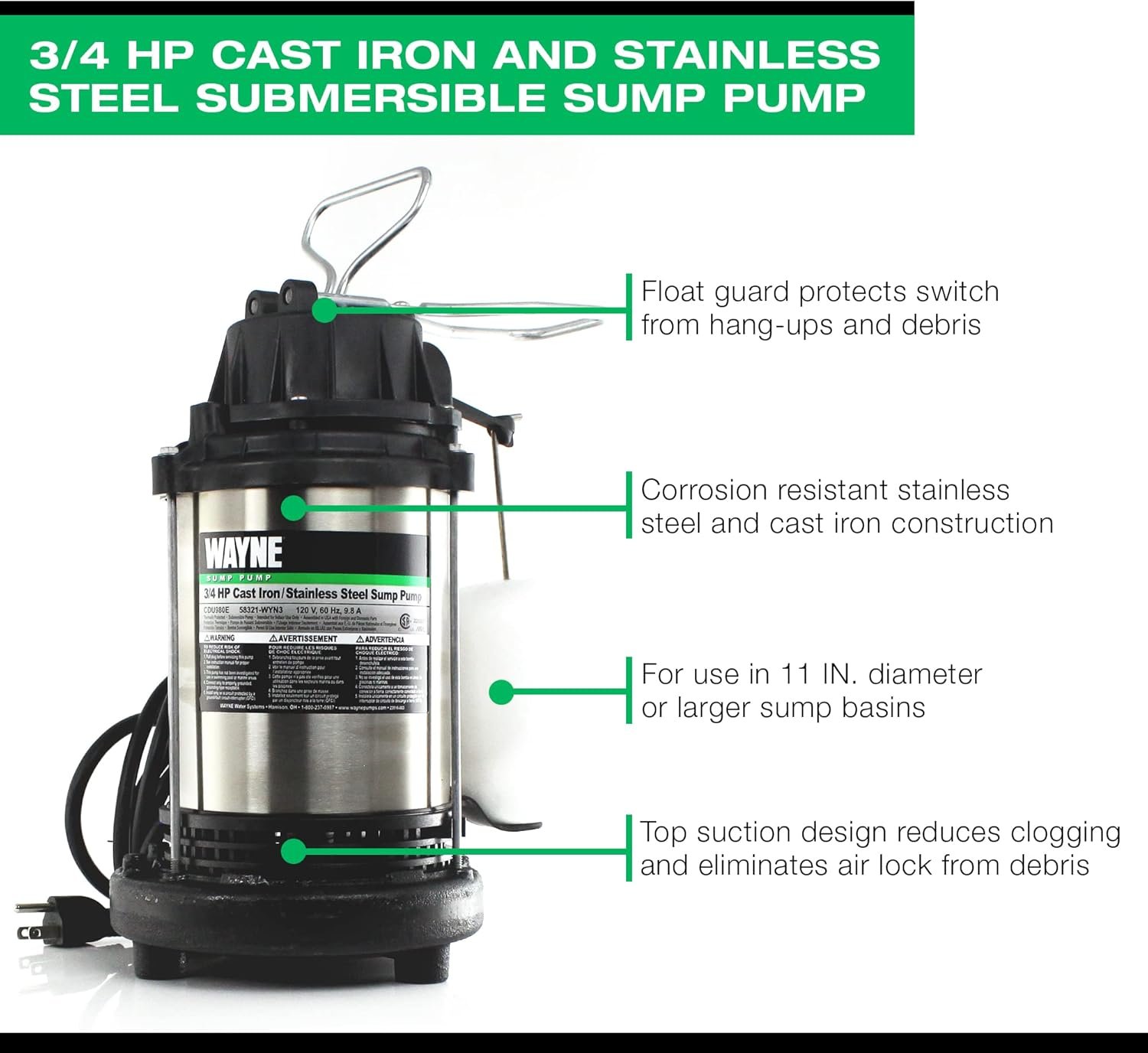 The WAYNE CDU980E 3/4 HP Submersible Sump Pump combines a high-capacity 5,490 GPH motor with durable cast iron and stainless steel construction, ensuring powerful and long-lasting basement protection from flooding. Its integrated vertical float switch allows for automatic, reliable operation even in narrow pits, while the top suction design prevents clogs and simplifies installation. Assembled in the USA and backed by a 5-year warranty, this Wayne Store sump pump is a smart, ultra-quiet investment for any homeowner seeking peace of mind during heavy storms.