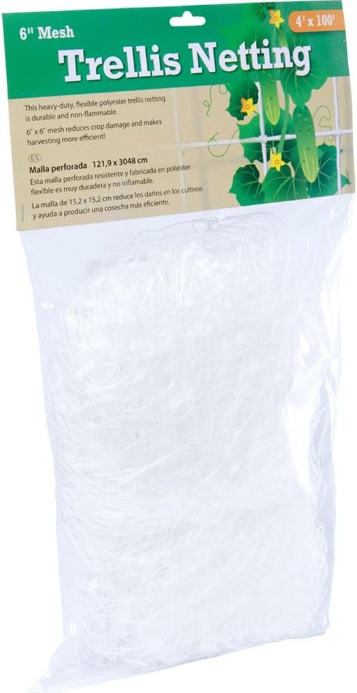 The Hydrofarm Trellis Netting offers a durable, soft woven string design with a generous 3.5" mesh and ample 5' x 30' coverage, making it ideal for supporting climbing plants. This netting from the trusted Hydrofarm Store helps protect your garden by reducing damage from ground-rot, insects, and rodents. With its sturdy construction, it encourages bigger, healthier, and earlier harvests. Upgrade your gardening setup with this easy-to-use trellis and enjoy impressive results season after season.