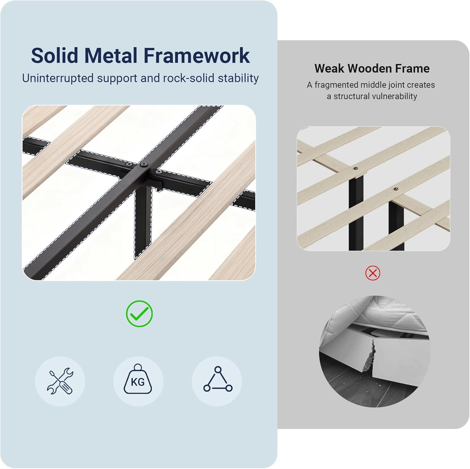 - Sturdy Wooden Slats: Enjoy reliable wooden slats support that fits latex, memory foam, or spring mattresses—no box spring required for this platform frame.