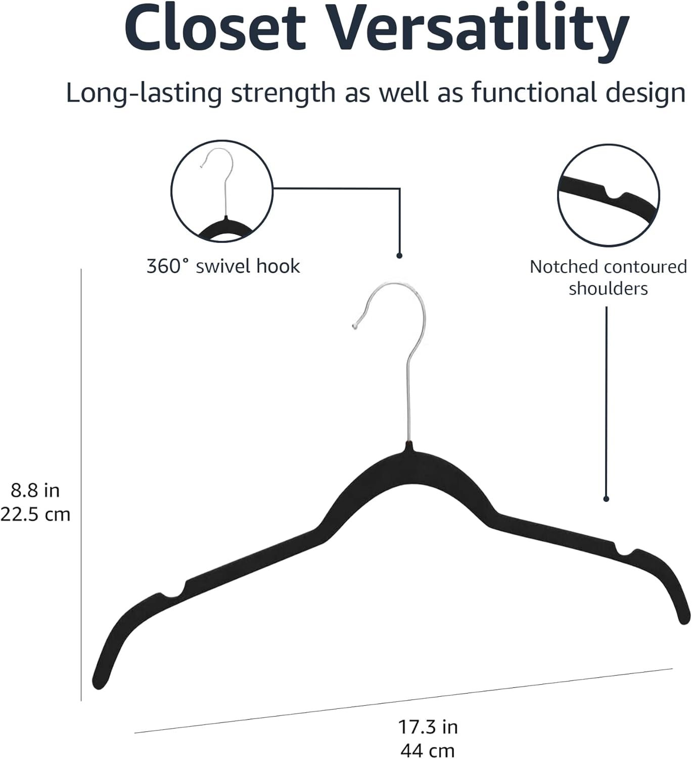 Organize your closet efficiently with the Amazon Basics Space-Saving Slim Velvet Non-Slip Clothes Hangers. This 50-pack features a sleek black design with sturdy construction—each hanger holds up to 10 pounds and boasts a slim profile to maximize space. The non-slip velvet surface and shoulder notches keep shirts, jackets, and dresses securely in place. Upgrade to these durable hangers from the Amazon Basics Store for a tidier, more stylish closet.