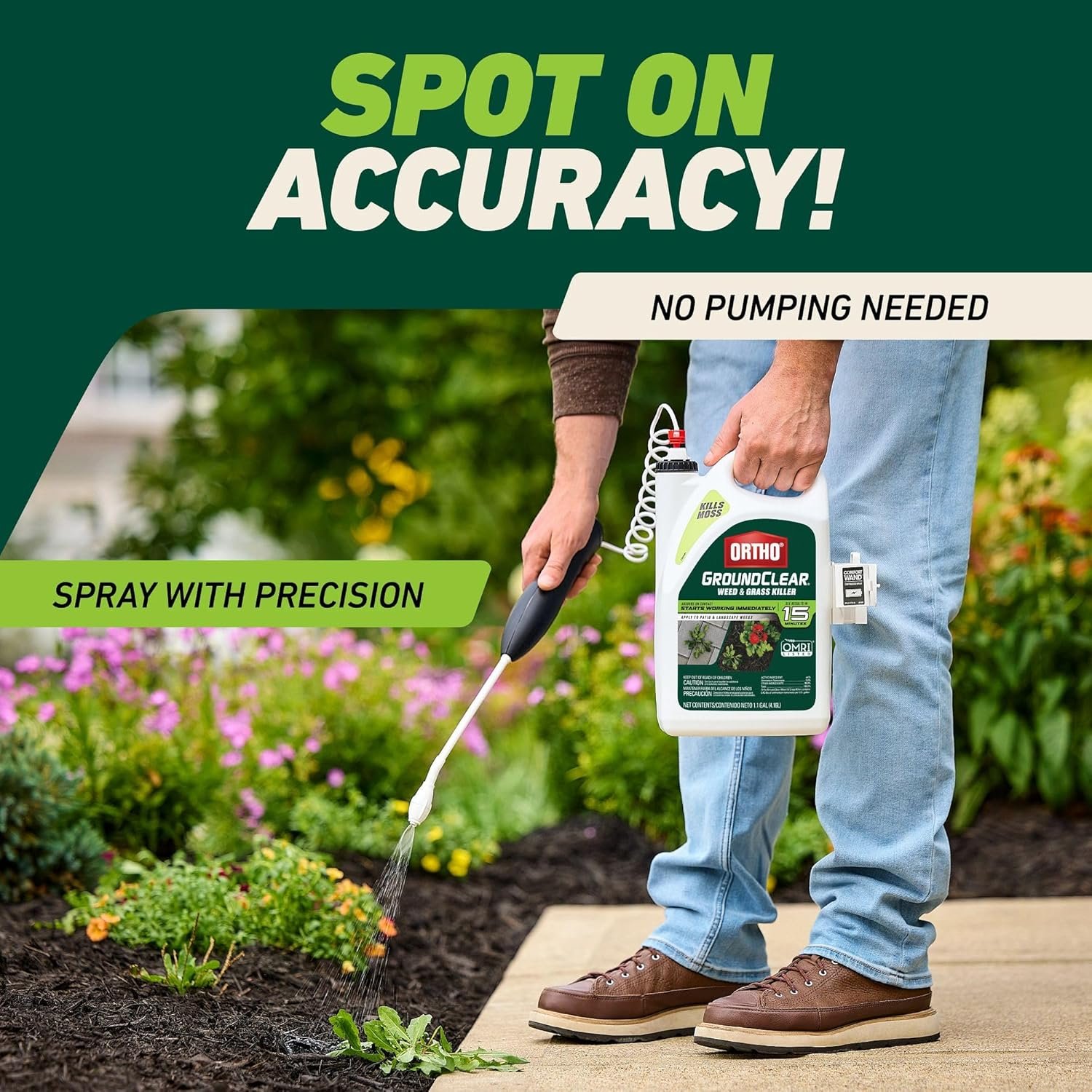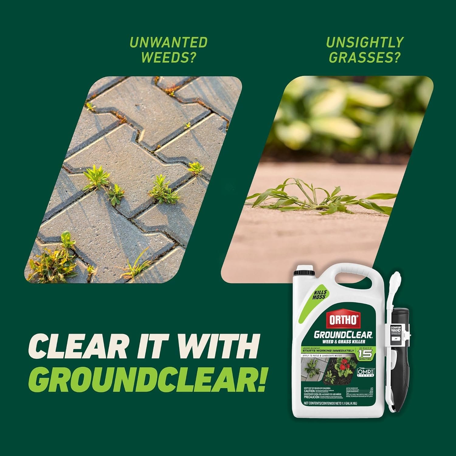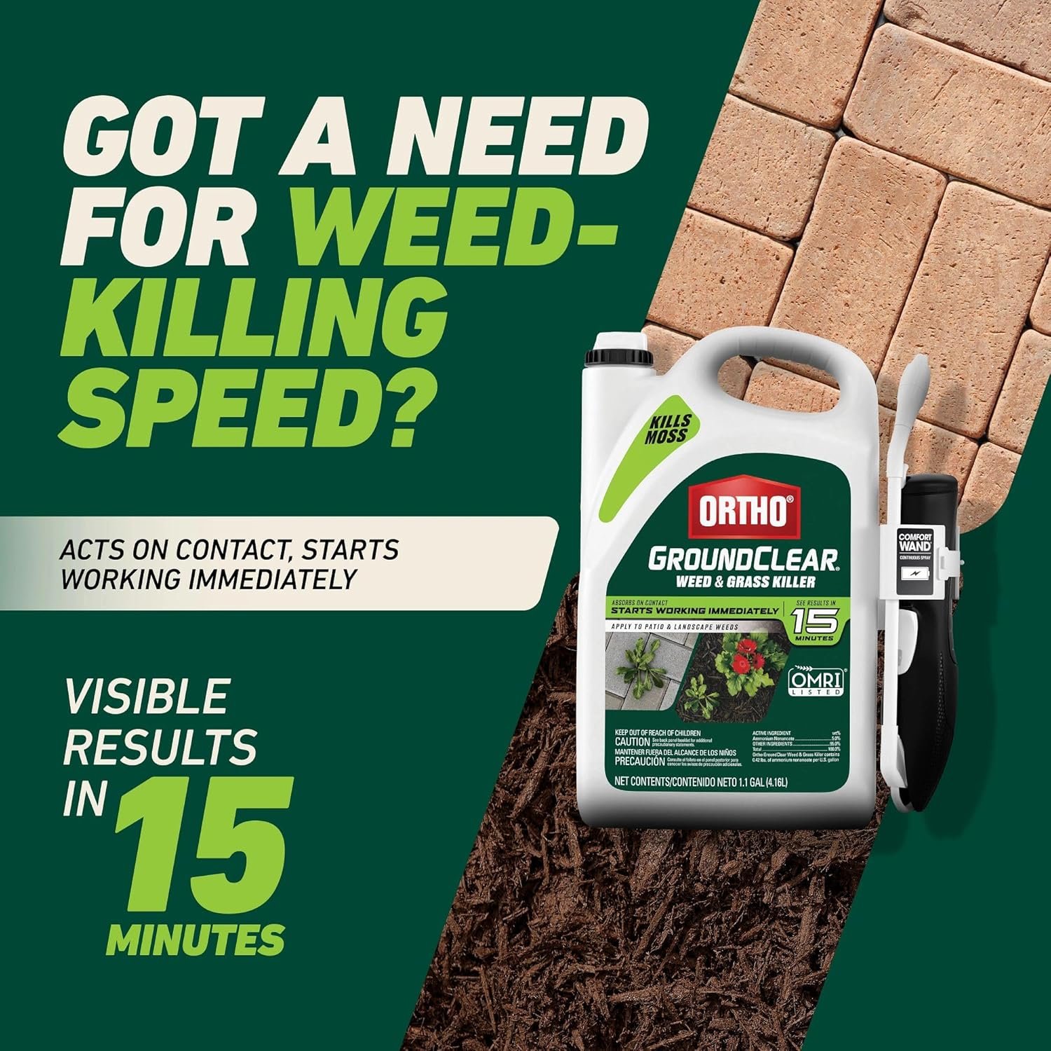 This fast-acting formula produces visible wilting and color change to targeted weeds in as little as 15 minutes. Full die-off can be seen in 1–2 days for most species—making it one of the fastest contact herbicides for dandelion control and crabgrass removal. - Is Ortho GroundClear OMRI listed?